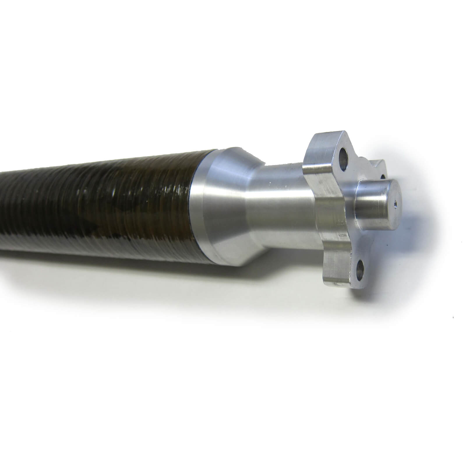This is the new DSS Coupler Eliminator Carbon Fiber driveshaft. This shaft will mount directly to the metal flanges on the vehicle, without the rubber guibo couplers, which are prone to deformation and eventually failure in high HP applications. We have redesigned these shafts to be a direct fit with no drilling of your stock flanges or other modifications required, and we also include new grade 12.9 hardware to mount it. These driveshafts feature our own CNC billet aluminum ends that are precision machined a second time, after the driveshaft is fully assembled, to ensure perfect centerline. We then high speed balance the shaft to eliminate any possibility of vibration. This specially wound carbon fiber tubing was originally designed for a 4500lb vehicle, calculating a traditional first gear torque multiplier of the transmission behind the engine, which will far exceed that of any torque tube application. The shaft is approximately 6.7 lbs and will withstand well over 900HP.
